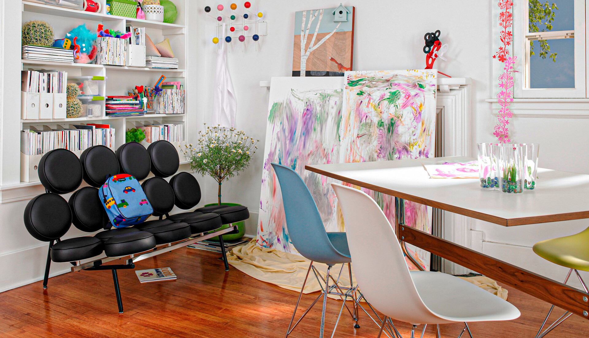 Диван “маршмеллоу” будет эффектно смотреться в творческом дизайне фьюжн. Оригинальная мебель в ярких тонах подчеркнет другие предметы необычных форм и станет центральным элементом интерьерной композиции.