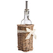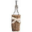 Эстетичная бутылка для жидких приправ изготовлена из стекла с металлическим дозатором, нижняя часть бутылки помещена в плетеную корзинку, изыскано перевязанную кружевной ленточкой, лаконично впишется в интерьер кухни.