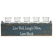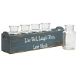 Набор из пяти стеклянных бутылок, оформлен в искусственно состаренный деревянный ящик. Этот дизайн подчеркивает красоту добротно сделанной вещи, гармонично впишется в интерьер кухни в стиле кантри. Нанесенный на ящик известный слоган — Жить хорошо, смеяться часто, много любви — обязательно поднимет вам настроение и вдохновит на новые свершения. Размер ящика: 36*9*14. Размер бутылки: 7*7*12.