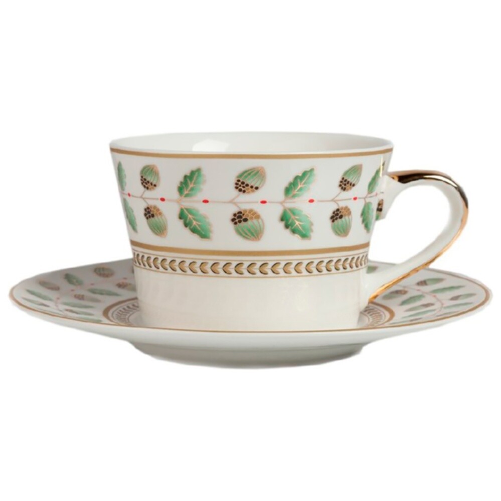 Желуди, дубовые листья, спокойная расцветка и золотая кайма — все выдаёт тонкий вкус владельца чайной пары Flober. От расцветки веет теплом, спокойствием, а тонкий костяной фарфор безупречно вписывается в любую сервировку чаепития. Современная выпечка или класическое печенье — все будет аппетитно смотреться на блюдце с таким растительным орнаментом. в нашем интернет-магазине также представлены комплекты тарелок из коллекции Flober с таким же орнаментом.