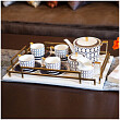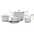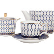 Очаровательный набор из костяного фарфора превратит ваше чаепитие в приятный ритуал. Он будет элегантно смотреться, как в частном доме, так и в престижном ресторане. Беспроигрышное сочетание белого, темно-синего и золотого цветов придает набору классическую изысканность и благородство. Все изделия набора выполнены в одном стиле и безупречно сочетаются между собой. Сервиз рассчитан на 4 персоны и состоит из чайника, 4 чайных пар (чашка и блюдце), молочника и сахарницы.