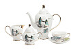 Состав: Чашка диаметром 10 см - 4 шт., блюдце диаметром 15 см - 4 шт., молочник диаметром 8 см и высотой 11 см - 1 шт., сахарница - 1 шт., чайник - 1 шт.