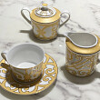 Чайные сервизы Marbella, изготовленные из английского фарфора, станут украшением для стола в любом доме. Заслуженно прославленный на весь мир материал, изобретенный мастерами «туманного Альбиона» для использования в самых роскошных домах Лондона, теперь доступен и для вас! Каждый элемент этого сервиза отличают изысканные формы, которые придадут классическому интерьеру черты нового времени, а современный интерьер сделают более нежным и утонченным. Белоснежный, но теплый фарфор, ручная роспись в стиле знаменитого дома Эрмес (Hermes), яркие и насыщенные цвета орнамента — все это можно сказать о нашей коллекции посуды. Набор из 11 предметов: 4 чашки, 4 блюдца, чайник, молочник и сахарница. Чашка 9*9*6,5 см, блюдце 14*14*1 см, молочник 9*9*10 см, сахарница 9*9*10 см
