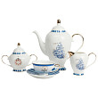 Сервиз Viaggio, который напомнит о морях и дальних странствиях! Эта модель выполнена из костяного фарфора белого цвета. Каждый предмет сверху и снизу украшен полосатой окантовкой в синем и голубом цвете, ручки посуды имеют золотистое покрытие. Чайник и молочник украшены рисунками старинного парусного корабля, на сахарнице красуется роза ветров, а на чашке — рисунок в форме корабельного руля. Сервиз на 4 персоны: 4 пары (чашка+блюдце), молочник, сахарница, кофейник (чайник).