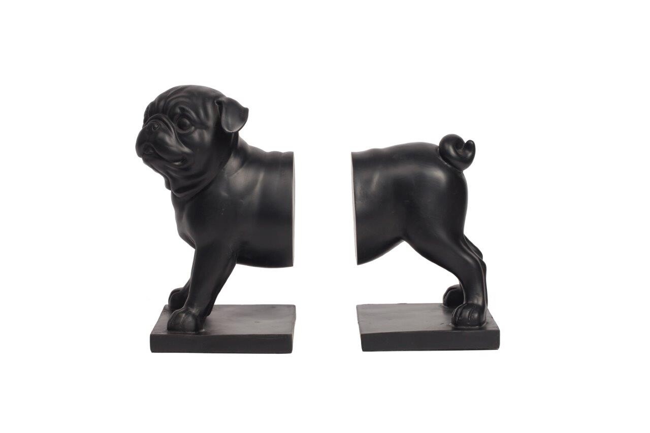 Держатель для книг изготовлен из полирезина в виде разделенного надвое чёрного мопса. При помощи этой поставки-держателя книжную полку можно оформить вполне неординарно. Скульптура мопса достаточно правдиво детализирована и поэтому узнаваема. Набор получился эстетичный и применим по назначению. Идеальный элемент декора и подарок для любителя собак.