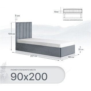 Кровать односпальная с подъемным механизмом и ящиком для белья 90х200 серо-голубая Вега