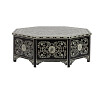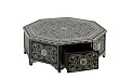 Низкий Журнальный столик Pintado в марокканском стиле — настоящее произведение искусства. Он выполнен из дерева в черном цвете и расписан вручную нежными цветами и лепестками практически по всей поверхности. Столик имеет форму восьмиугольника, одна из граней дополнительно украшена серебристой ручкой — если потянуть за нее, откроется небольшой ящик для хранения. Столик Pintado станет достойным украшением гостиной в классическом стиле или в стиле Арт-деко.