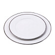 Комплект тарелок Gera выполнен из качественного фарфора. Большая тарелка диаметром 25,5 см, маленькая диаметром 20,5 см белого цвета с серебряной каймой. Можно использовать отдельно, а также в комплекте с чайной парой Gera.