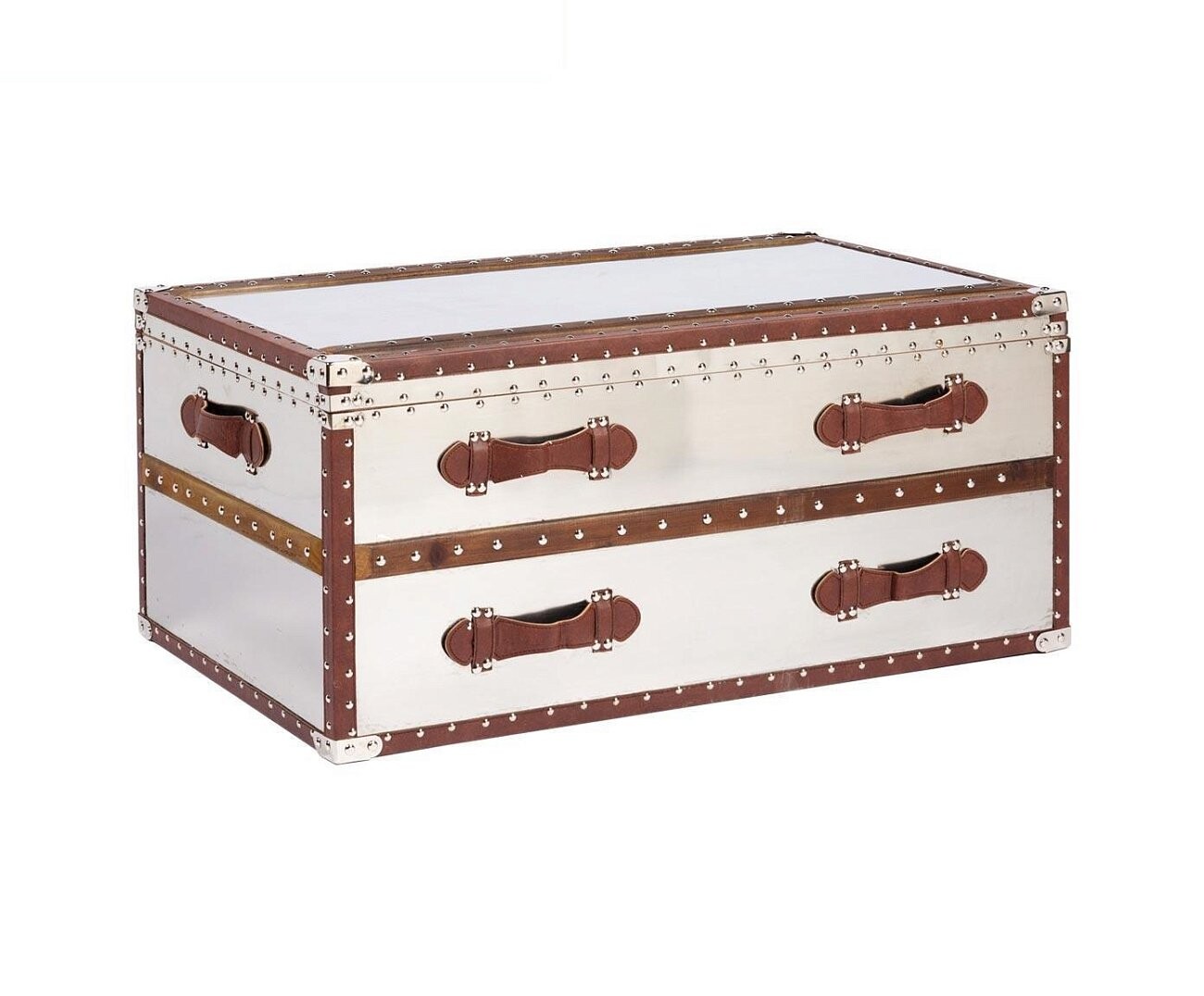 Декоративный чемодан-тумба для хранения Movie Star — это очаровательный предмет украшения вашего дома, который непременно добавит ему уюта, изысканности и неповторимости. Особенностью аксессуара является то, что изготовлен он из нержавеющей стали, имеет коричневую окантовку, декорированную заклепками и широкие удобные ручки. Чемодан, благодаря размерам, является достаточно вместительным, а его поверхность можно использовать как подставку или тумбу.