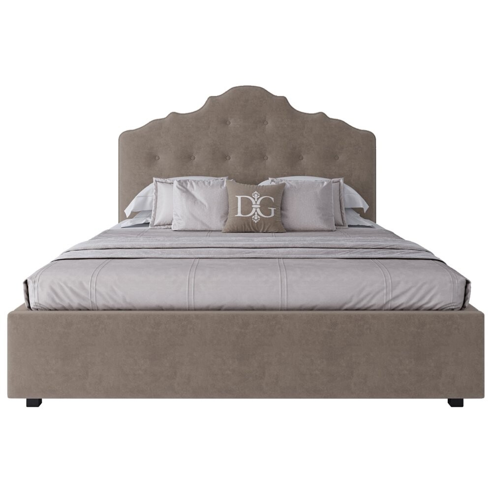 Каркас кровати изготовлен из МДФ, на ножках из алюминиевого сплава. Высокое фигурное изголовье, обитое велюром, украшено стёжкой капитоне.