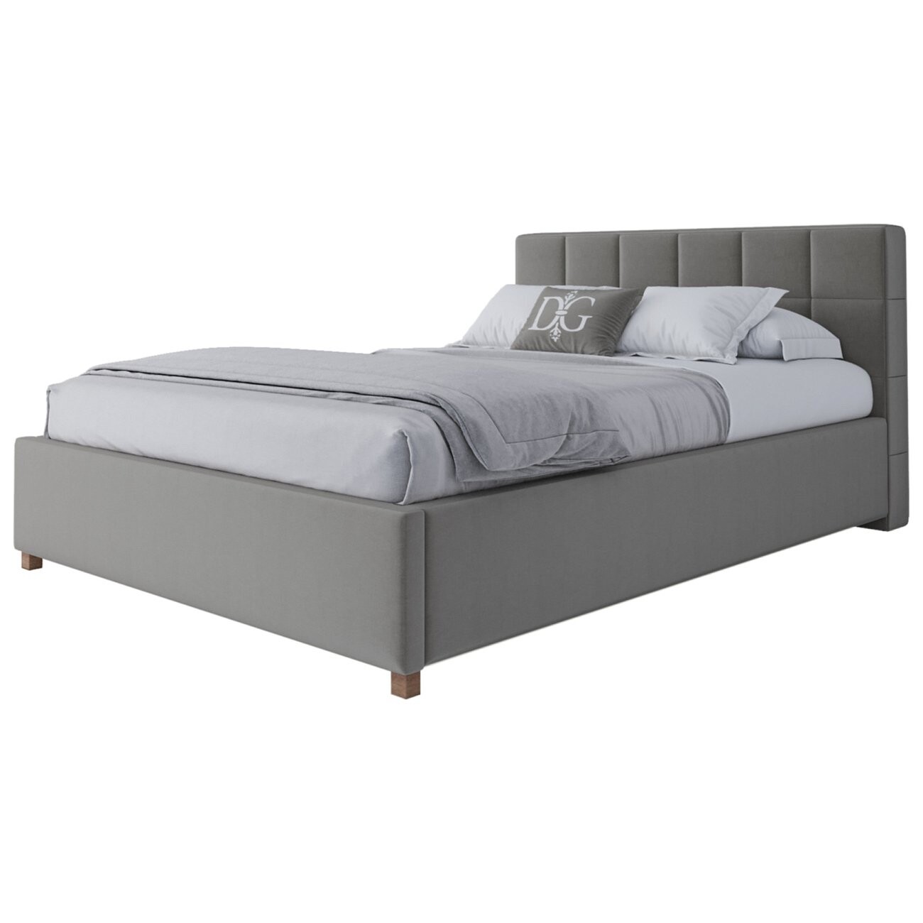 У изделия прочный и надежный каркас из МДФ на устойчивых ножках, высокое изголовье, декорированное квадратным рисунком.