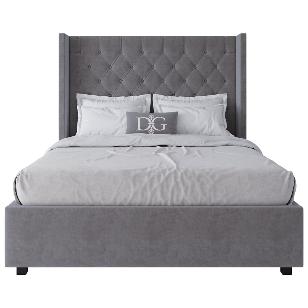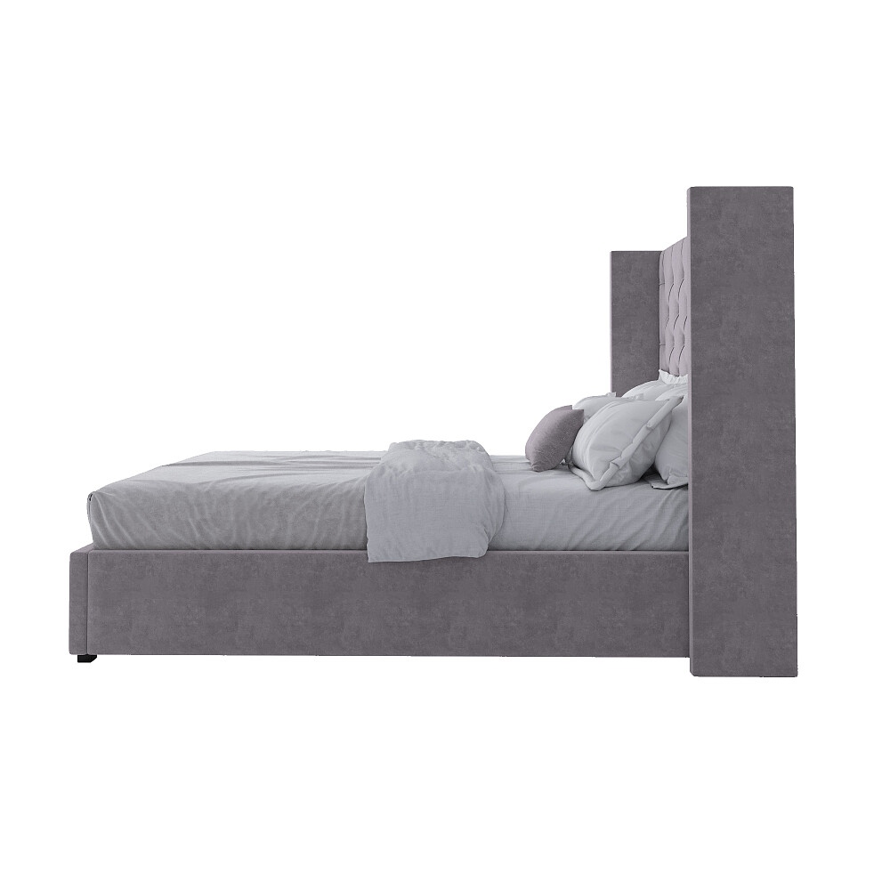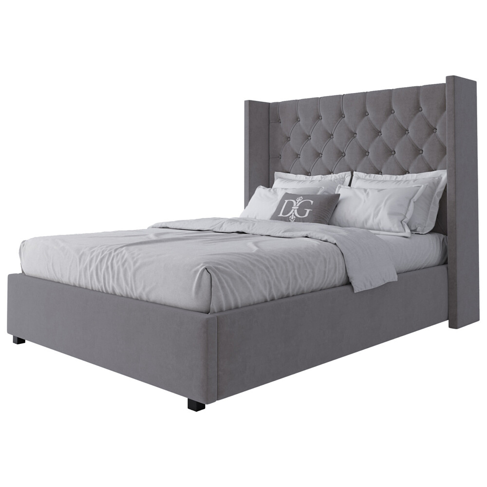 Изголовье с каретной стяжкой и «ушами», прошивка обивки из мебельного велюра с пропиткой от загрязнения и спрятанные в каркасе из натурального дерева (сосна) ножки, будут смотреться оригинально в сочетании со строгими формами.