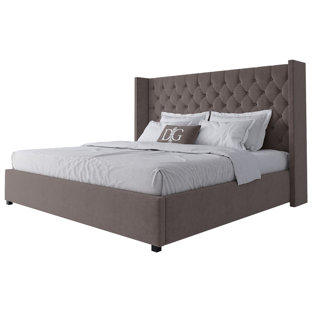 Изголовье с каретной стяжкой и «ушами», прошивка обивки из мебельного велюра с пропиткой от загрязнения и спрятанные в каркасе из натурального дерева (сосна) ножки, будут смотреться оригинально в сочетании со строгими формами.