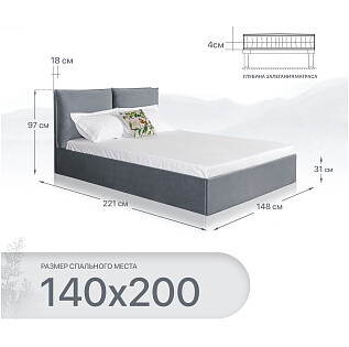 Кровать полутораспальная с подъемным механизмом и ящиком для белья 140х200 жемчужно-серая Вега