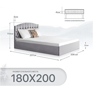 Кровать двуспальная с подъемным механизмом и ящиком для белья 180х200 жемчужно-серая Грация