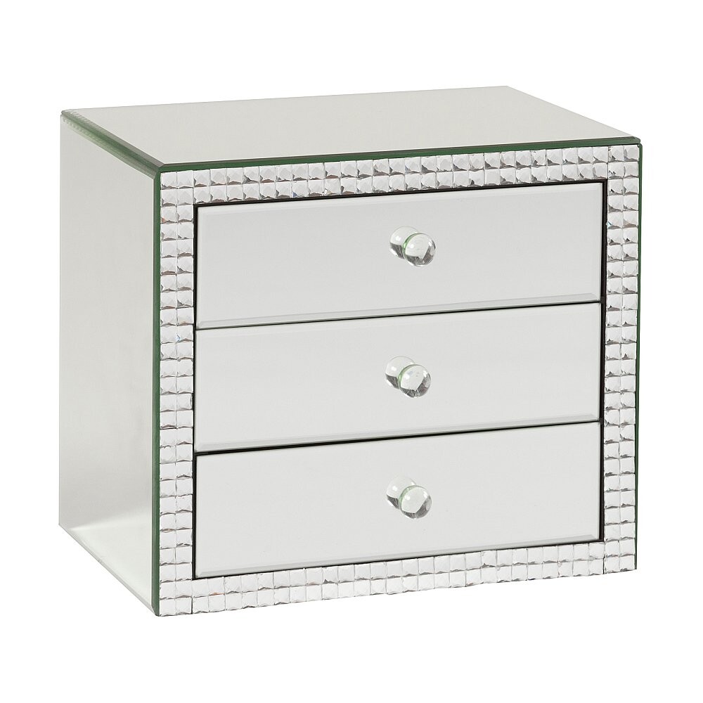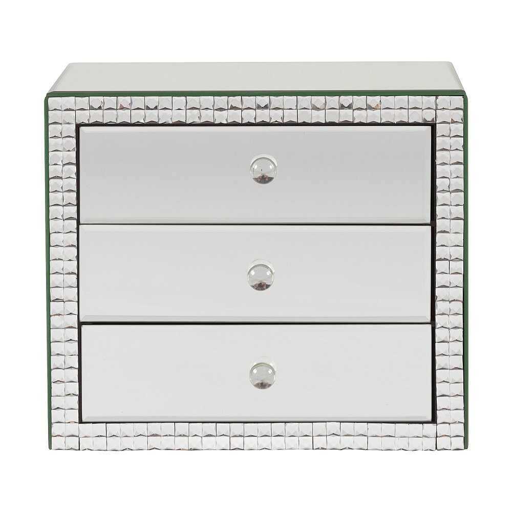 Внимание к деталям и украшениям должно быть тоже выдержано в стиле. Декоративный мини-комод Lorient будет держать ваши украшения и драгоценности в сохранности и уюте. Этот предмет меняет отношение к простым шкатулкам для безделушек. Изысканная значительная шкатулка подойдет, когда вы знаете, что следует в ней хранить. Мини-комод выполнен из МДФ и декорирован с каждой стороны зеркальной поверхностью. Имеет три выдвигающихся ящичка с круглыми ручками. По краям оформлен зеркальной мозаикой. Придаст интерьеру элегантности, станет отличным аксессуаром среди интерьеров в стиле арт-деко, лофт, прекрасно дополнит любую стильную современную комнату.