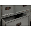 Строгой конструкции высокий стеллаж Grattacielo окрашен в серый цвет, имеет характерные элементы состаривания в виде сильных потёртостей, изготовлен полностью из натурального дерева (вяз). Сверху расположены три открытых полки, внизу — ещё две, посредине — пять весьма удобных выдвигающихся ящички разных размеров с металлическими ручками, благодаря этому стеллаж достаточно функционален. Этот качественно сделанный стеллаж позволит создать свой индивидуальный интерьер и наполнить его идеями из прошлого.