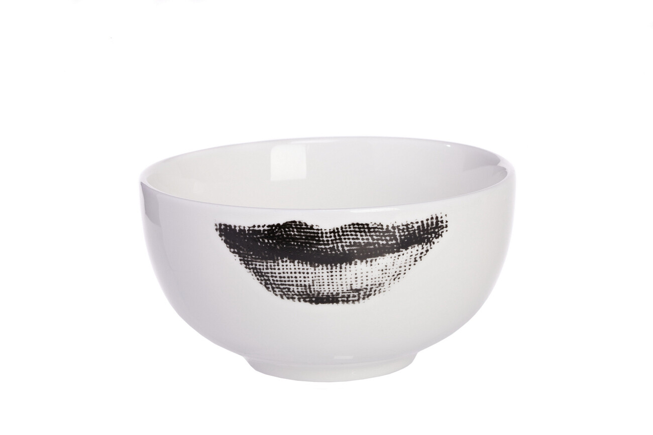 Созданный под вдохновением творчества великого итальянского художника Пьеро Форназетти (Piero Fornasetti) (его коллекции «Лица», посвященной талантливой актрисе Лине Кавальери) изящный керамический порционный салатник изготовлен из белоснежного костяного фарфора. На внешней поверхности нанесен принт в виде губ серебреного цвета, благодаря этому он выглядит притягательно.  Салатник можно приобрести как отдельно, так и в дополнение к другим предметам этой же коллекции.
