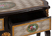 Элитная консоль Corsica представляет собой произведение интерьерного искусства. Элегантная форма, приятное сочетание цветов, богатый декор — все это делает модель эксклюзивной. Консоль выполнена из дерева в чёрном цвете. Под столешницей из МДФ расположен декор, в котором присутствуют пастельные цвета: зелёный, кремовый, розовый, голубой. По бокам располагаются объемные золочёные элементы декора. Ножки консоли выполнены из натурального дерева (берёза).