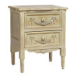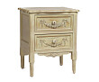 Эта тумбочка смотрится изящно, как благодаря элегантной форме, так и благодаря приятному кремовому цвету. Тумба сделана в модной состаренной манере, кажется, что это вещь из прошлой эпохи. Тумба выполнена из дерева (ели), у нее есть два вместительных ящика, они украшены декоративной резьбой и фигурными ручками. Ножки тумбы также имеют необычную форму.