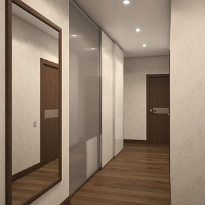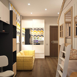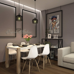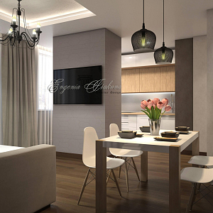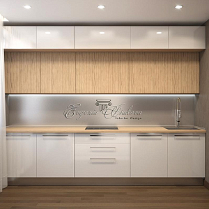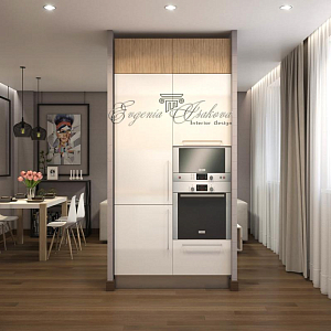 Интерьер кухни с подсветкой настенной, подсветкой светодиодной, проходной, рейками с подсветкой, с подсветкой, светильниками над столом и световыми линиями в стиле лофт и в современном стиле, проект «Квартира в современном стиле с нотками лофта» №1