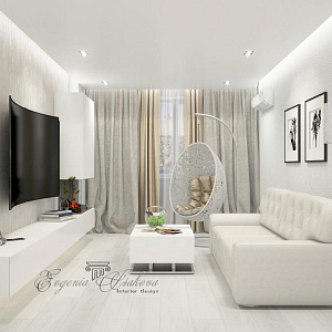 Интерьер гостиной с гостиной-прихожей, гостиной-столовой и проходной в современном стиле, проект «Белая гостиная с камином» №1
