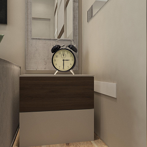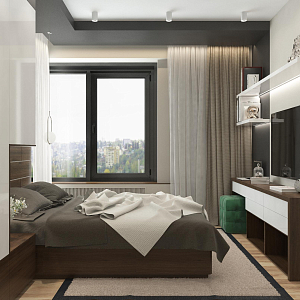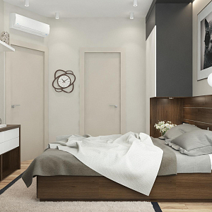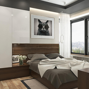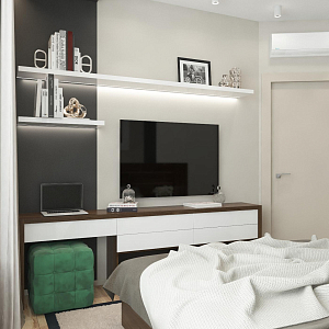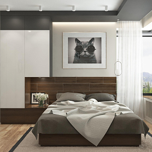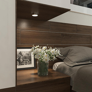 Интерьер спальни с бра над кроватью, керамогранитом на стену с телевизором, нишей для телевизора, нишей с подсветкой, панно за телевизором, подсветкой настенной, подсветкой светодиодной, рейками с подсветкой, с подсветкой, светильниками над кроватью, свет №29