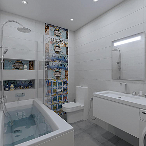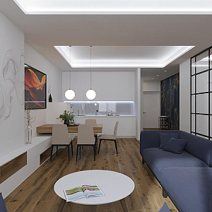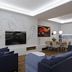 Интерьер столовой с подсветкой настенной, подсветкой светодиодной, рейками с подсветкой, с подсветкой и световыми линиями, проект « SW-1 ЖК Мосфильм Москва 71 кв.м., Квартира» №3
