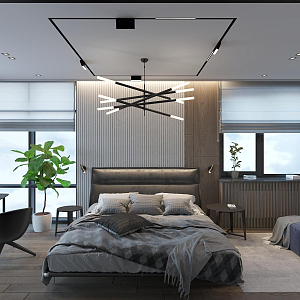 Интерьер спальни cветовыми линиями, рейками с подсветкой, подсветкой настенной, подсветкой светодиодной и светильниками над кроватью в стиле лофт, проект «Легкий, но строгий, Квартира» №4