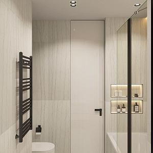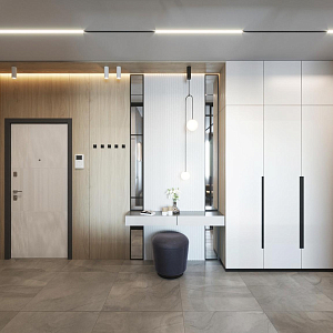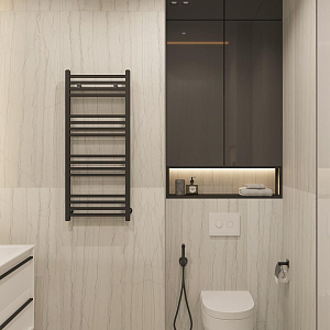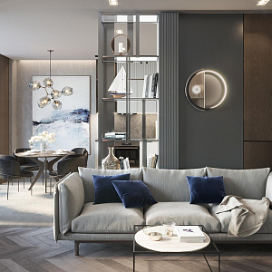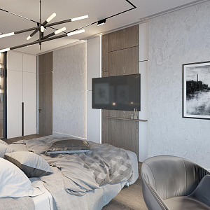 Интерьер спальни с подсветкой настенной, подсветкой светодиодной, рейками с подсветкой, с подсветкой, светильниками над кроватью и световыми линиями в стиле лофт, проект «Легкий, но строгий, Квартира» №7