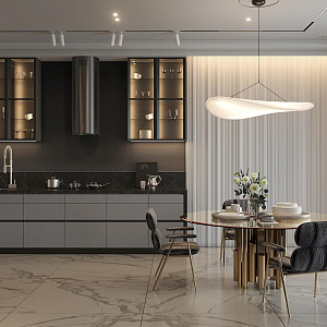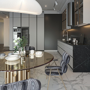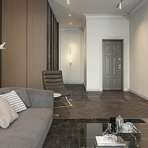 Интерьер гостиной с подсветкой настенной, подсветкой светодиодной, рейками с подсветкой, с подсветкой, светильниками над кроватью и световыми линиями, проект «Необарокко. Кухня-гостиная, Комната» №5