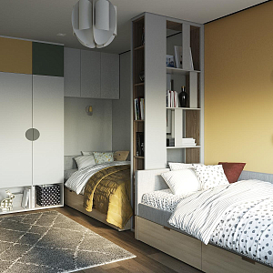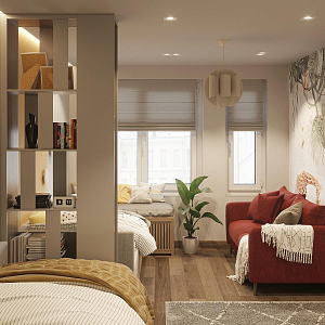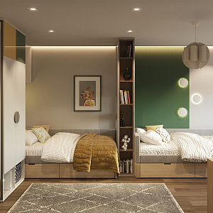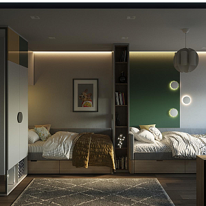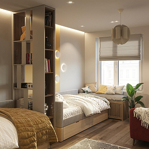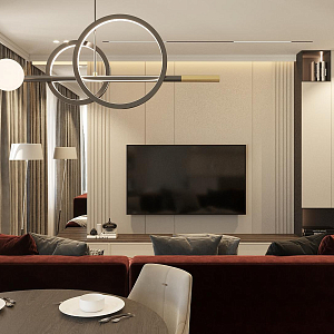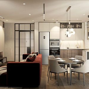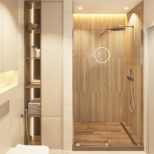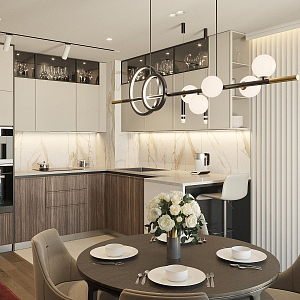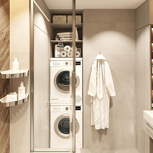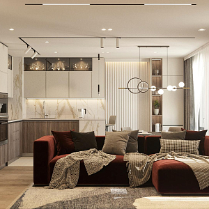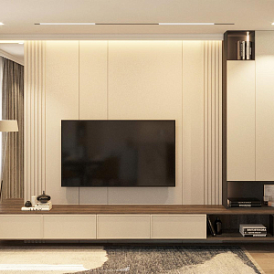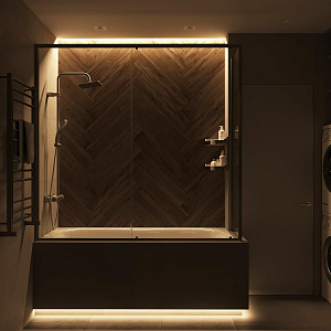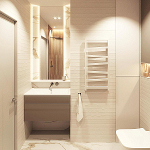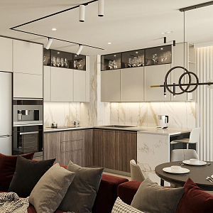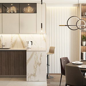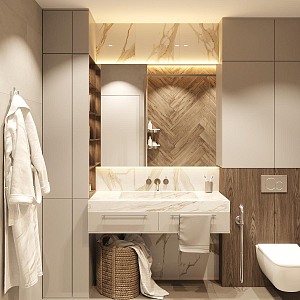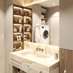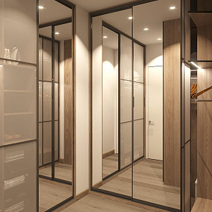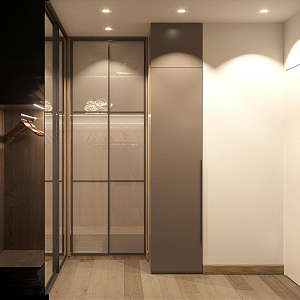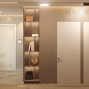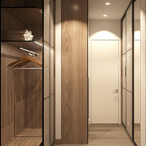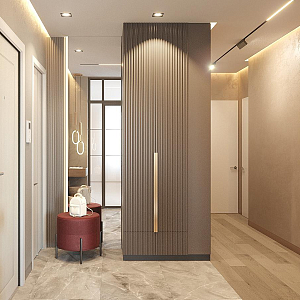 Интерьер коридора с проходной, световыми линиями, рейками с подсветкой, порогом, подсветкой настенной и подсветкой светодиодной, проект «Изысканный, современный с яркими акцентами, Квартира» №18