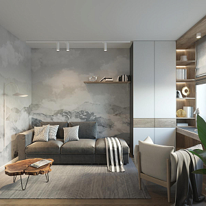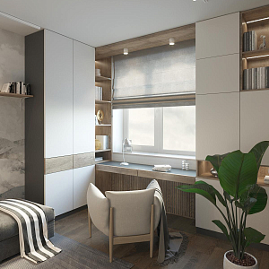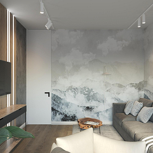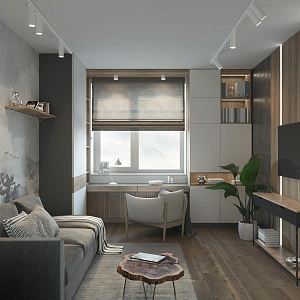 Интерьер гостиной с зонированием рейками, световыми линиями, телевизором на рейках, вертикальными жалюзи, рейками с подсветкой, подсветкой настенной и подсветкой светодиодной, проект «Современный сканди. Детская, Комната» №3