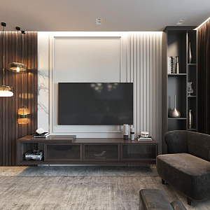 Интерьер гостиной с панно за телевизором, стеной с телевизором, телевизором на рейках, телевизором на стене и керамогранитом на стену с телевизором, проект «Неоклассика в двух вариантах. Кухня-гостиная, Комната» №1