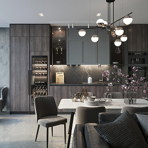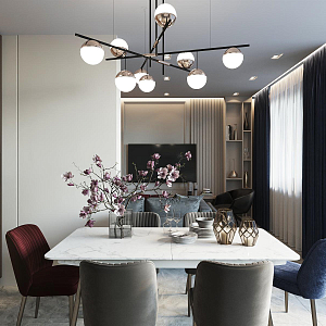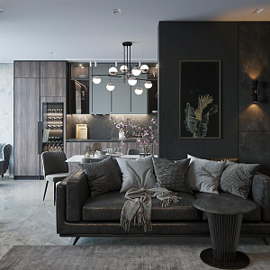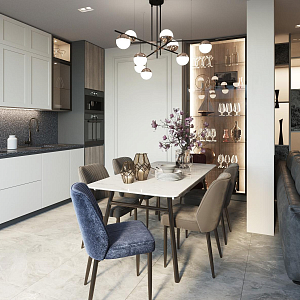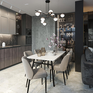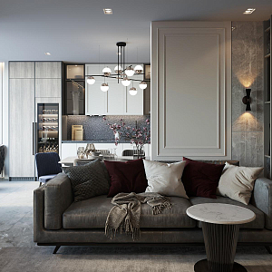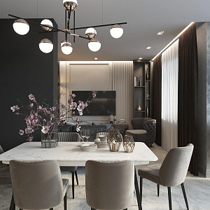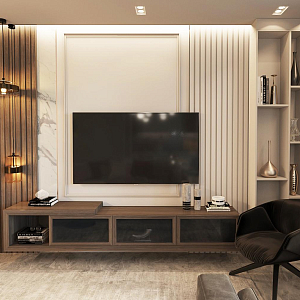 Интерьер гостиной с панно за телевизором, световыми линиями, стеной с телевизором, телевизором на рейках, рейками с подсветкой, подсветкой настенной и подсветкой светодиодной, проект «Неоклассика в двух вариантах. Кухня-гостиная, Комната» №2