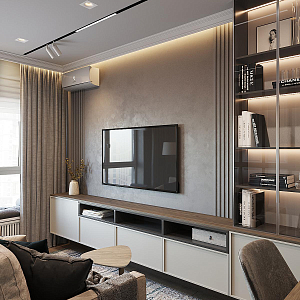 Интерьер гостиной с панно за телевизором, световыми линиями, стеной с телевизором, телевизором на рейках, телевизором на стене, керамогранитом на стену с телевизором и подсветкой настенной, проект «Проект "Воздушный в сливочных оттенках" м. Фрунзенская Са №18