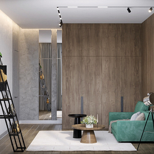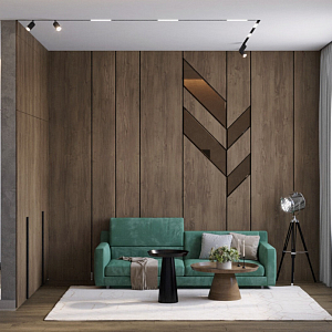 Интерьер гостиной с панно за телевизором, световыми линиями, керамогранитом на стену с телевизором, рейками с подсветкой, подсветкой настенной и подсветкой светодиодной в современном стиле, проект «Гостиная в ЖК Южные кварталы» №1