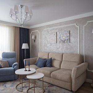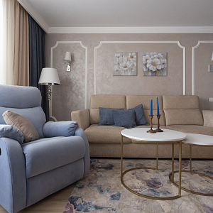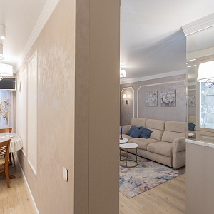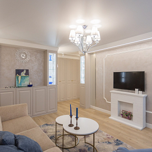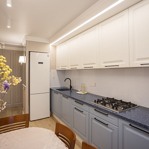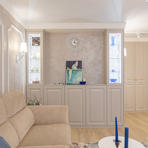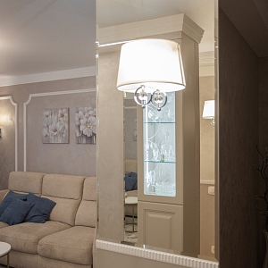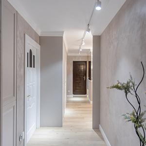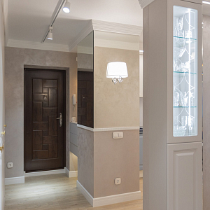 Интерьер коридора с рейками с подсветкой, подсветкой настенной, подсветкой светодиодной и подсветкой рабочей зоны в классическом стиле, проект «Реализованная квартира Современная Классика» №3