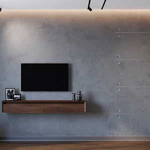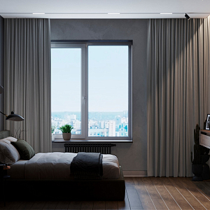 Интерьер спальни с вертикальными жалюзи, подсветкой настенной, подсветкой светодиодной, рейками с подсветкой и световыми линиями в современном стиле, проект «Спальня с харизмой» №4