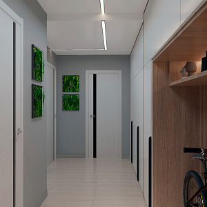 Интерьер гостиной с подсветкой настенной, подсветкой светодиодной, рейками с подсветкой, с подсветкой, светильниками над кроватью и световыми линиями в современном стиле, проект «Квартира в ЖК Мира» №22