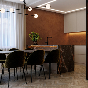 Интерьер кухни с нишей с подсветкой, подсветкой настенной, подсветкой светодиодной, рейками с подсветкой, с подсветкой и световыми линиями в стиле лофт, проект «Квартира в стиле LOFT» №6
