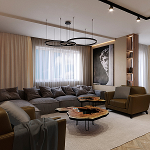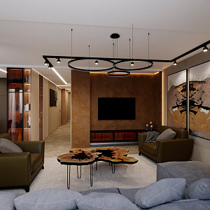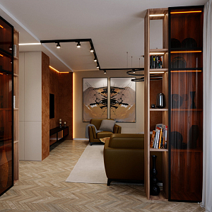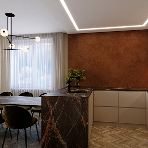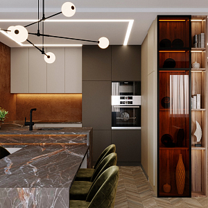 Интерьер кухни с нишей с подсветкой, подсветкой настенной, подсветкой рабочей зоны, подсветкой светодиодной, рейками с подсветкой, с подсветкой, светильниками над кроватью, светильниками над столом и световыми линиями в стиле лофт, проект «Квартира в стил №7