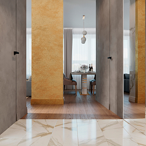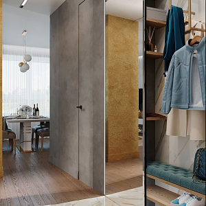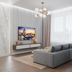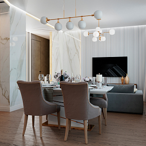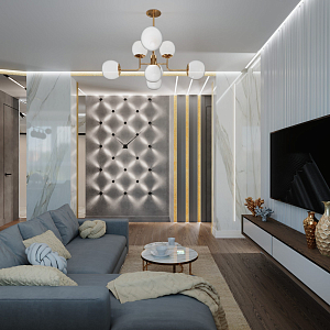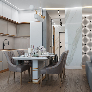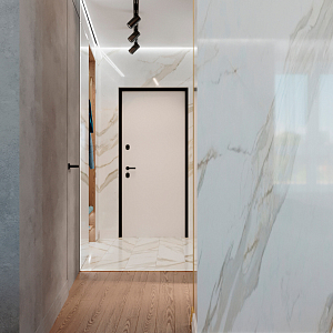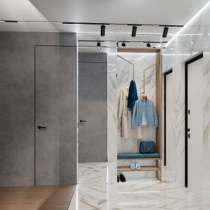 Интерьер с подсветкой настенной, подсветкой светодиодной, рейками с подсветкой, с подсветкой и световыми линиями в современном стиле, проект «Квартира с итальянским мрамором» №5