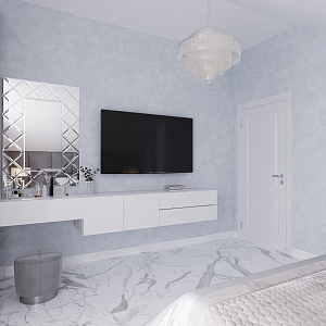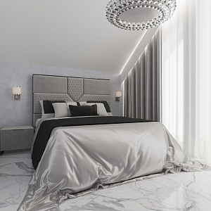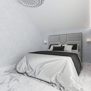 Интерьер спальни с подсветкой настенной, подсветкой светодиодной и светильниками над кроватью в современном стиле, проект «Квартира в современном стиле в СНТ "Святая Гора"» №17