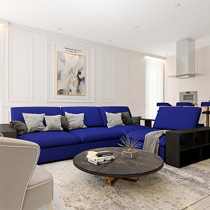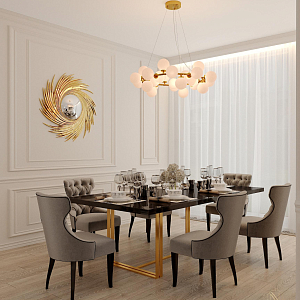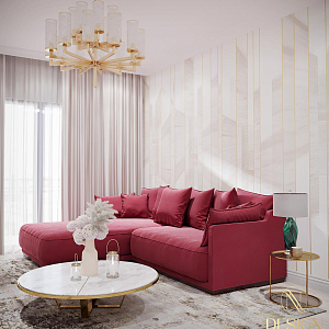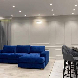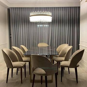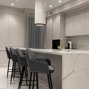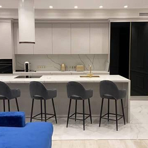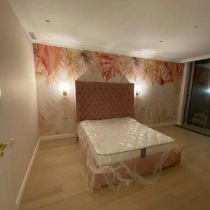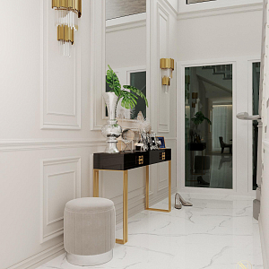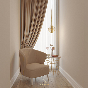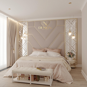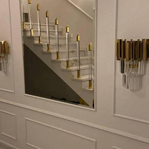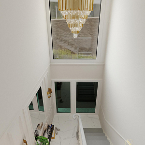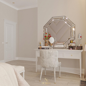 Интерьер спальни с гостиной-прихожей, зеркалом в нише, зеркалом на двери, кухней-гостиной с коридором, лестницей, нишей, нишей из плитки, проемом и проходной, проект «Таунхаус Барвиха 288 кв.м, Таунхаус» №4