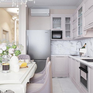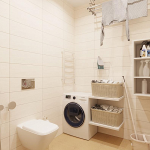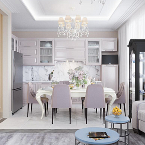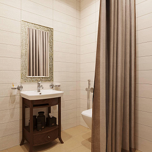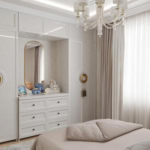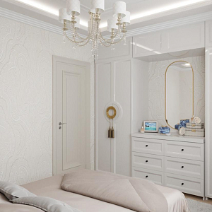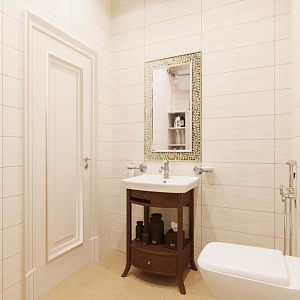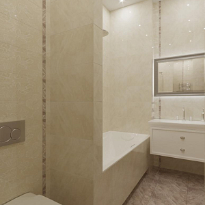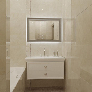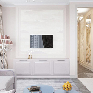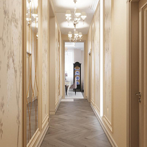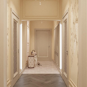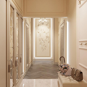 Интерьер коридора с нишей из плитки, нишей с подсветкой, подсветкой настенной, подсветкой светодиодной, порогом, рейками с подсветкой, с подсветкой и световыми линиями в неоклассике, проект «Квартира в стиле неоклассики в ЖК "Vavilove"» №8