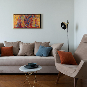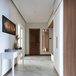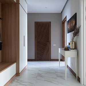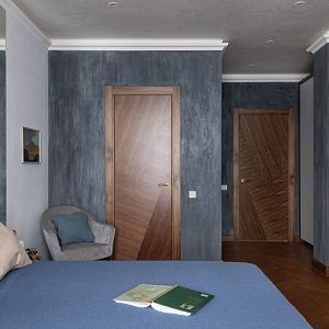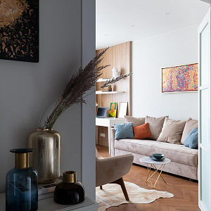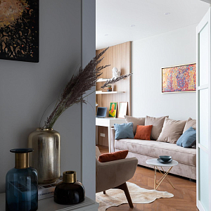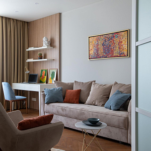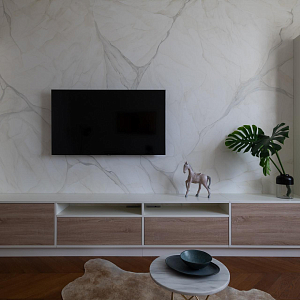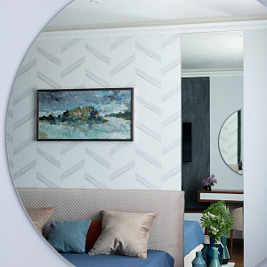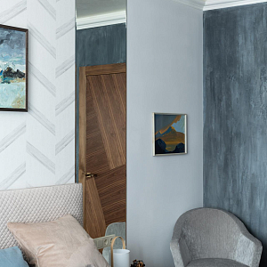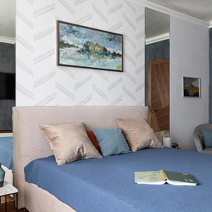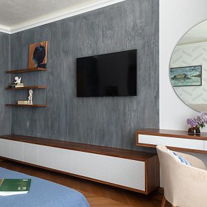 Интерьер гостиной с керамогранитом на стену с телевизором, нишей для телевизора, панно за телевизором, подсветкой настенной, стеной с телевизором и телевизором на стене в современном стиле, проект «Квартира в серо-голубых тонах в ЖК "Мосфильмовский"» №11