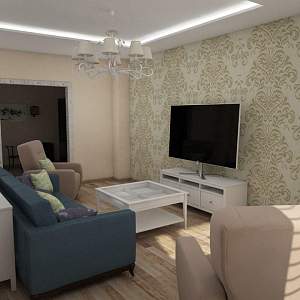 Интерьер гостиной с подсветкой настенной, подсветкой светодиодной, проходной, рейками с подсветкой, с подсветкой и световыми линиями, проект «3D визуализация квартиры для молодой семьи» №1