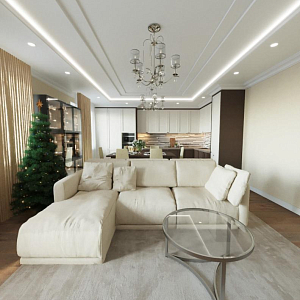 Интерьер спальни с подсветкой настенной, подсветкой светодиодной, рейками с подсветкой, с подсветкой, светильниками над кроватью и световыми линиями в неоклассике, проект «Квартира в стиле неоклассики в ЖК "Финист"» №12