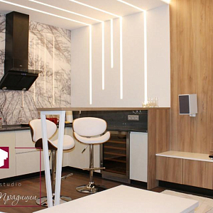 Интерьер cветовыми линиями, рейками с подсветкой, подсветкой настенной, подсветкой светодиодной и с подсветкой в современном стиле, проект «Квартира в современном стиле "Причал для путешественника"» №1